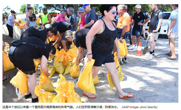 这是半个世纪以来第一个登陆昆州南部海岸的热带气旋。人们在积极准备沙袋,防御洪水。(图/澳广网中文截图)