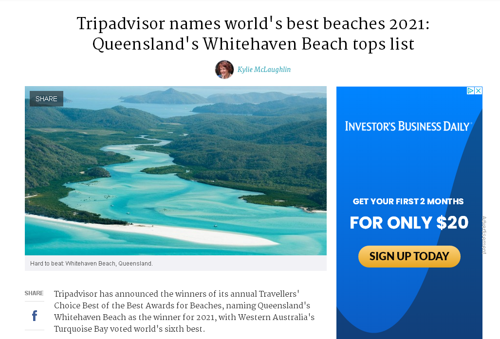 【澳洲网编译报道】国际性旅游评论网站猫途鹰(Tripadvisor)近日公布了年度游客选择的全球十大最佳海滩。其中,昆州的白天堂海滩(Whitehaven Beach)成为2021年最佳海滩奖的得主,西澳的绿松石湾(Turquoise Bay)则名列全球最佳海滩的第六位。