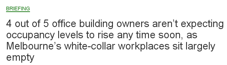 【澳洲网编译报道】墨尔本白领工作场所目前基本空置,数据显示,4/5写字楼业主不认为写字楼占用率会很快上升。