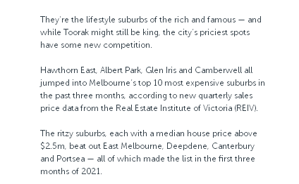 【澳洲网编译报道】维州房地产协会(REIV)近日公布的数据揭示了墨尔本最新的十大富人区榜单。图拉克(Toorak)地区依然位居榜首,但这座城市最昂贵的地段仍面临着新的竞争。
