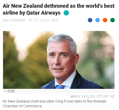 Stuff网站21日报道,这是AirlineRatings.com航空卓越奖项(AirlineRatings.com Airline Excellence Awards)所评选出的结果。据悉,该奖项衡量的标准包括机群年龄、乘客评论和产品供应等。新西兰航空公司在过去的几年中曾6次赢得冠军,但本次排名第二,仅次于卡塔尔航空。然而对这家航空公司来说,这并不全是坏消息,因为新西兰航空也赢得了太平洋最佳长途航空公司,最佳豪华经济舱和最佳经济舱奖项。