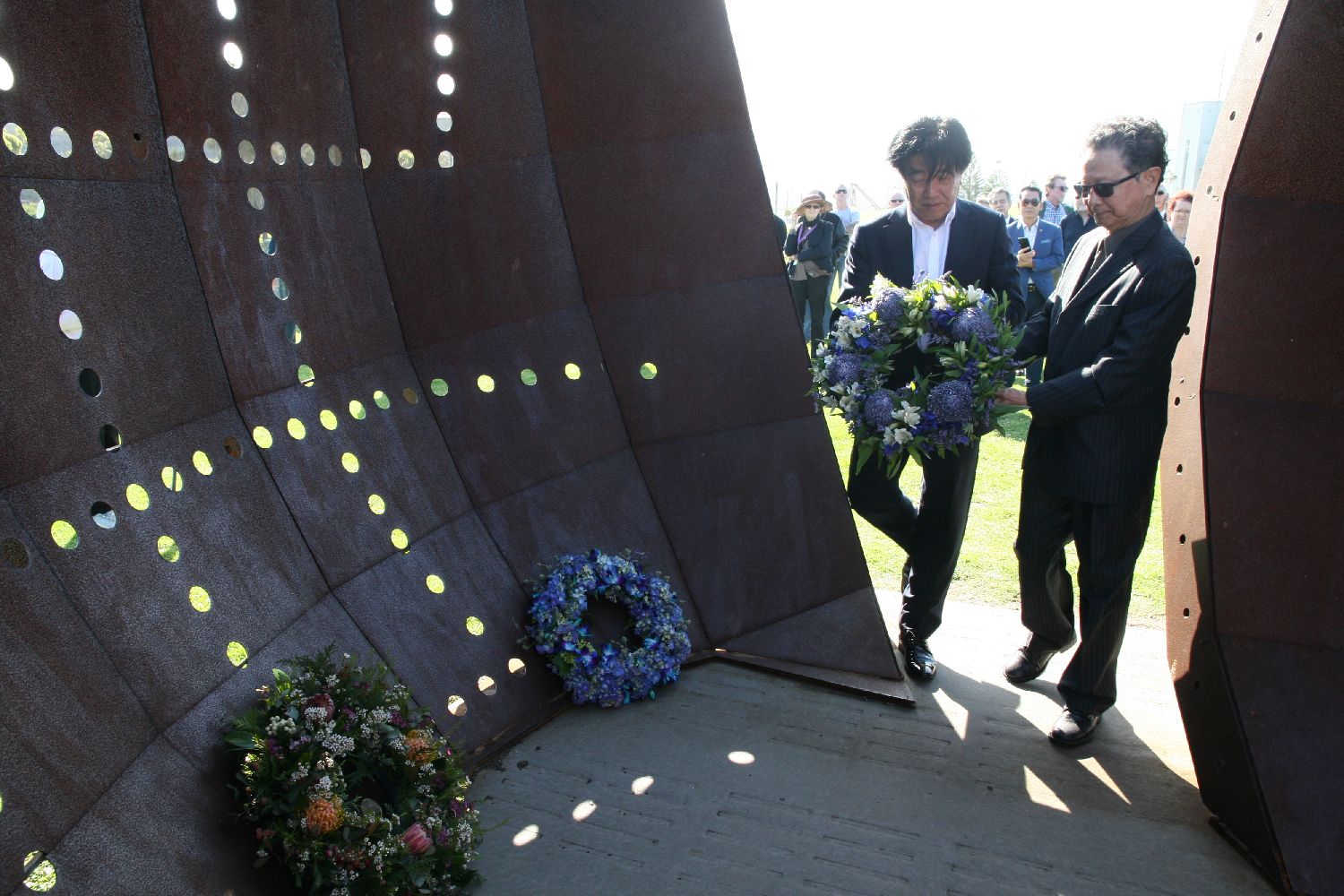 图为今年11月15日,澳洲侨界人士向达尔富拉姆争端纪念碑敬献花圈,向坎布拉港码头工人当年的义举表示致敬。