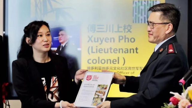 亚洲多元文化社区救世军军官傅三川上校为澳大利亚竹产业研究院颁发感谢证书,澳大利亚竹产业研究院副院长Jenny