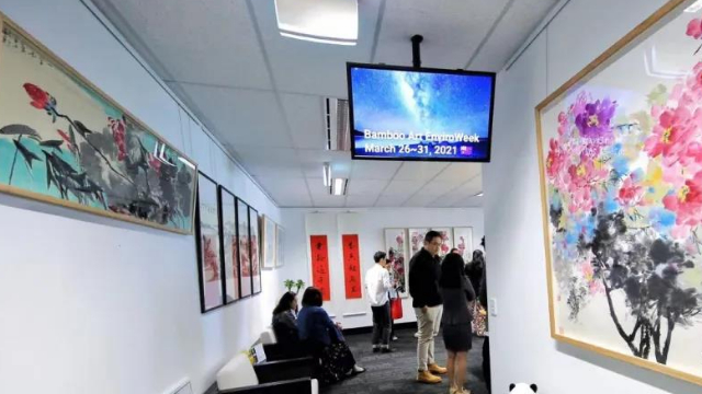 活动现场充满传统中华文化元素,每面墙上都挂满了中国特色的艺术创作字画,其中与竹相关的水墨画尤其引人注目,令人流连忘返。