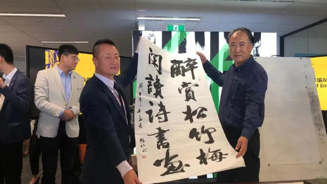 著名艺术家、画家杨春瑞先生也为本次活动专门创作了一幅字画“酒中龙凤”,并赠予澳大利亚竹产业研究院。“酒中龙凤”中“龙”寓意着汾酒作为中国最早国酒,是国酒中不可多得的龙头瑰宝;“凤”寓意着竹叶青如凤凰一般耀眼,将国酒发扬光大。