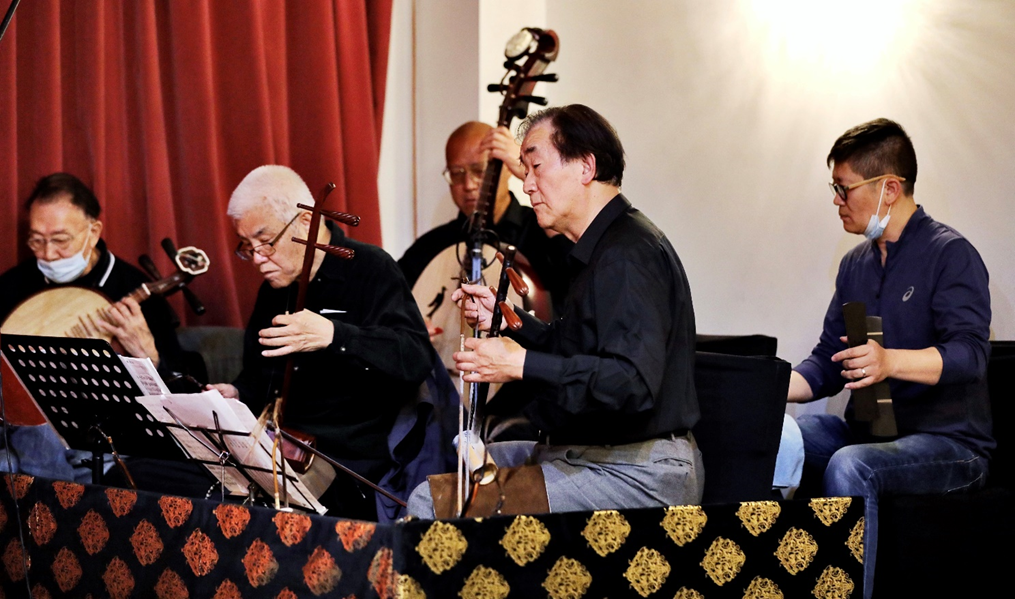 伴奏乐队的月琴-黄介东、京二胡-孙玄龄、弹拨乐器大阮-孙守义、京胡-汪依章和司鼓-许敏。(从左至右)
