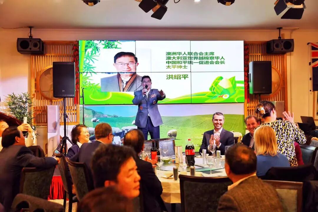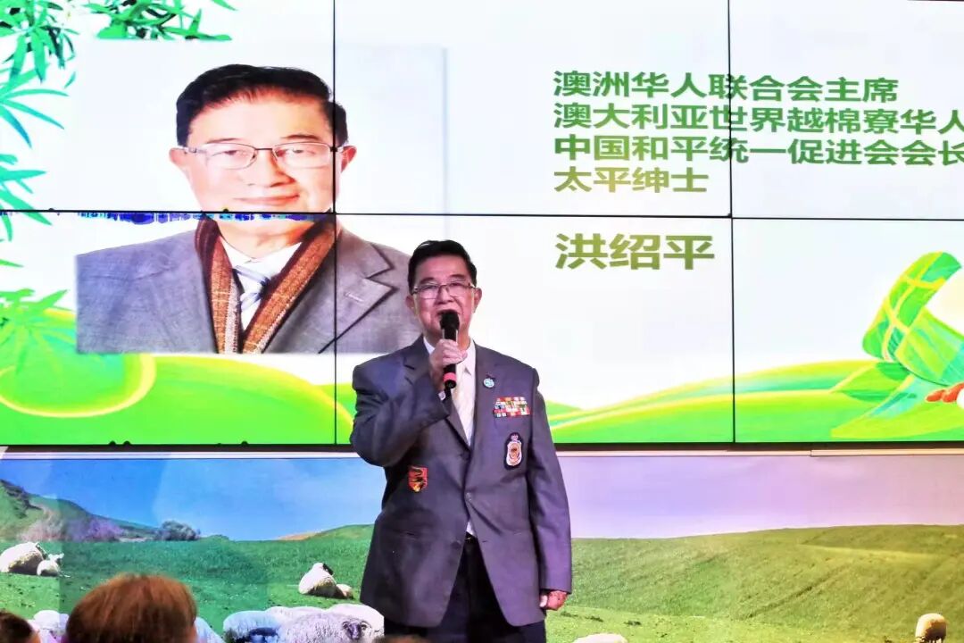 澳洲华人联合会主席、太平绅士洪绍平先生随后登台致辞。他深情地说道:由计建民先生任职执行主席实乃澳洲华人联合会的荣幸,感谢计建民先生多年来为澳洲多元文化的发展做出的重大和积极贡献!随后向洪主席在座嘉宾隆重介绍了莅临本次盛会的各位市长和议员,为他们对澳洲政府和社区发展做出的杰出贡献致以崇高的敬意!他表示:在新工党政府的领导下,澳洲会迎来新的明天、新的未来和新的希望,我们坚信工党政府不会辜负澳洲公民的期待,生活在澳洲的华人华侨也会积极投入到助力澳洲发展的各项事业中,为共创美好生活和丰富多元文化做出最大的努力。最后,真诚地祝福大家端午快乐,身体健康。