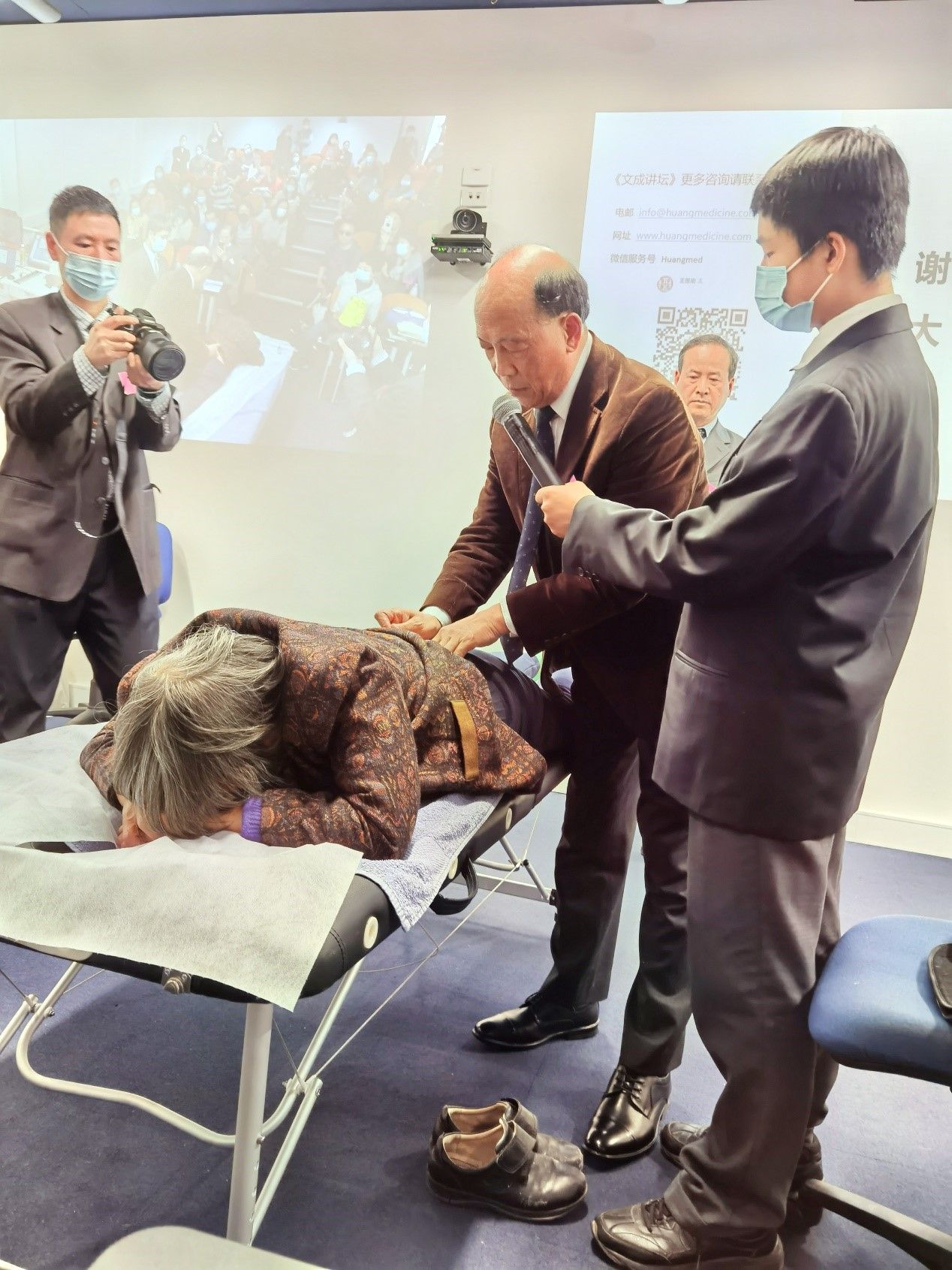 时间已到,原要结束今天的活动。突然走上来一位不速之客。一位老年女士,要求诊治双腿。王文成教授立马请她上治疗床,耐心地为她检查双腿病患程度。并为其施针医治。