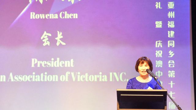 根据程序,他一一介绍了今晚应邀前来参加庆典活动的政界人士、社会贤达和诸多兄弟社团侨领等VIP嘉宾,紧接着邀请今晚晩会的主角,维州福建同乡会的新一届(第十七届)会长陈琛女士上台致辞。