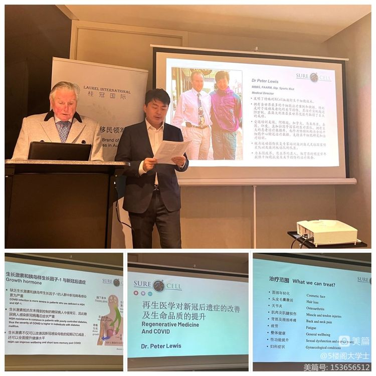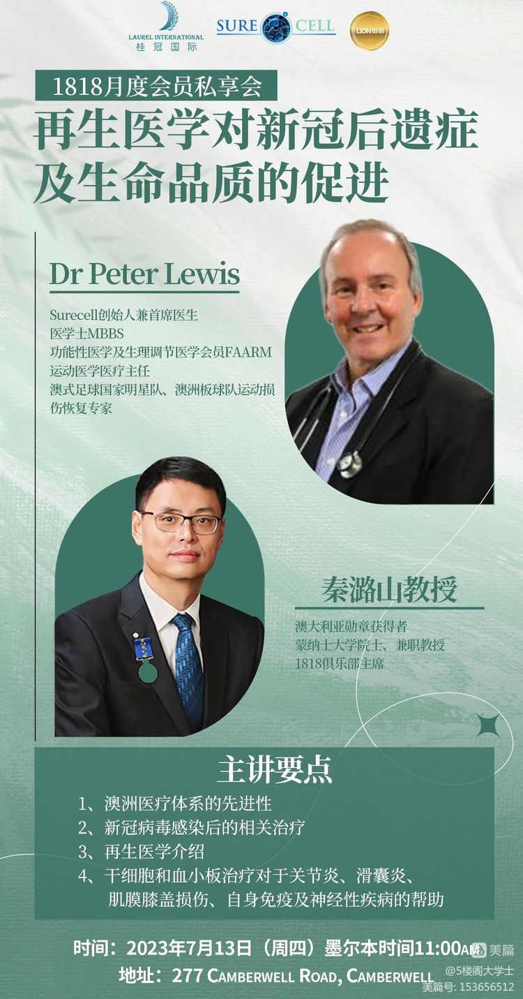 再次见到桂冠国际创始人陈红梅女士,我有点吃惊,似乎10多年的岁月从她身边悄悄溜走,没有留下什么痕迹。她邀请我参加明天“1818月度会员私享会”,活动主题“再生医学对新冠后遗症及生命品质的促进”,活动主讲人是大名鼎鼎的Dr Peter Lewis,长期指导澳式足球国家明星队、澳洲板球队的运动损伤康复专家,我很高心有机会参加这样有意义的活动。