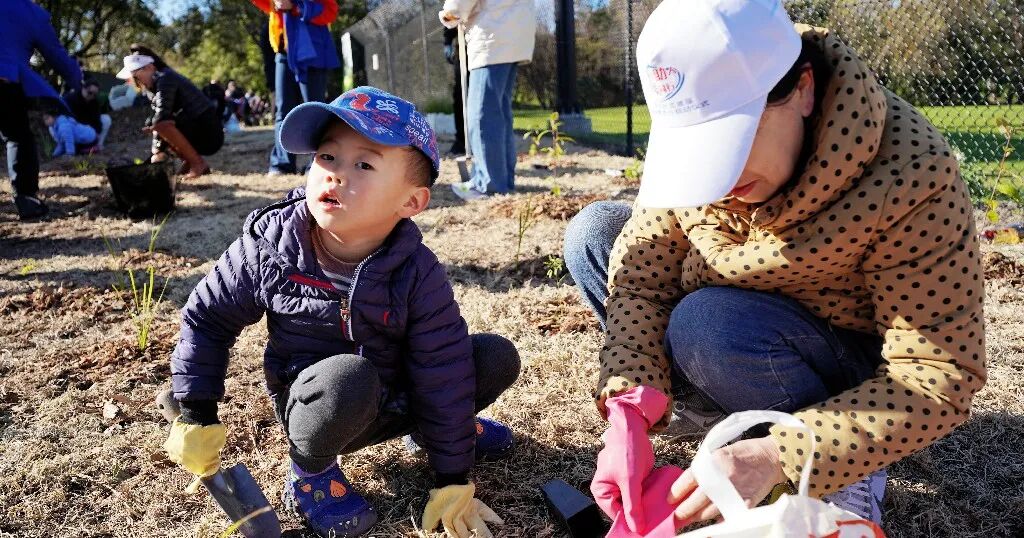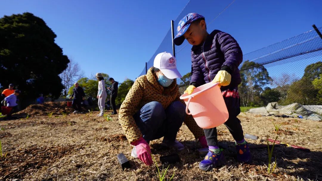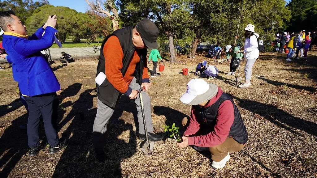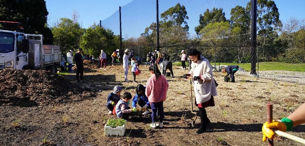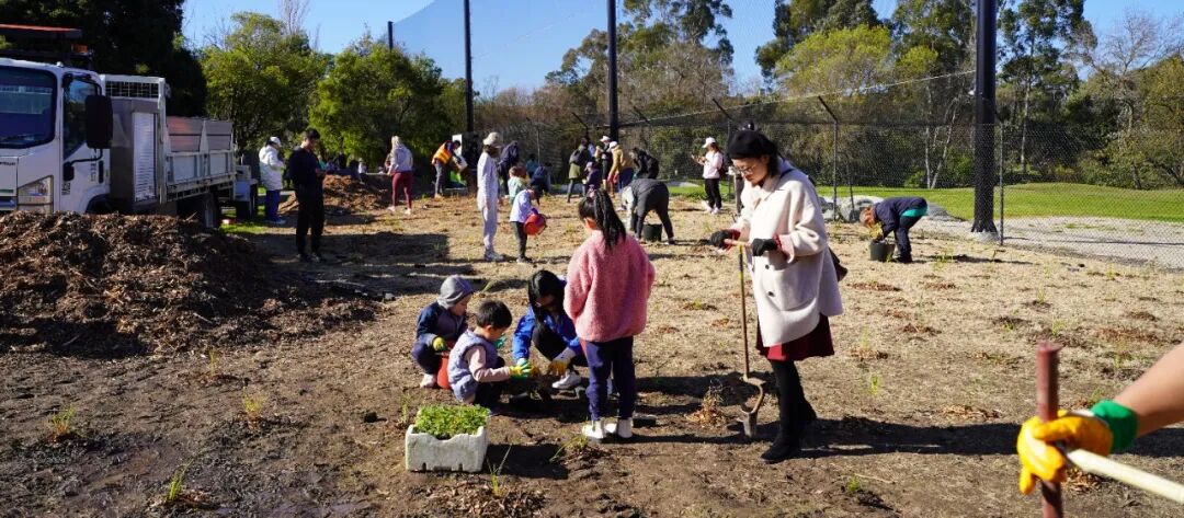 植树现场呈现出一派生龙活虎的热闹,除了新华狮子会外,还有很多其他华人社团参加。参加植树活动人员带着满腔的公益热情,参加人员年龄分布从80岁左右的老人到年仅4岁的孩子,有爷爷奶奶带着孙子孙女的;有情侣结伴情趣相投的;有父母带着孩子全家出动的的,每个人都非常投入地前后穿梭忙碌,挥锹铲土、扶苗、培土、踩实,干劲十足,一派火热的植树劳动景象。