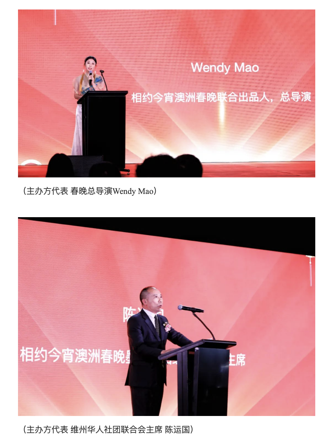 主办方代表,春晚总导演Wendy Mao在致辞中表示,墨尔本皇家展览中心是澳洲最具文化的历史建筑之一,与《相约今宵》这样一场代表着中华传统文化传承的盛会相得益彰。
