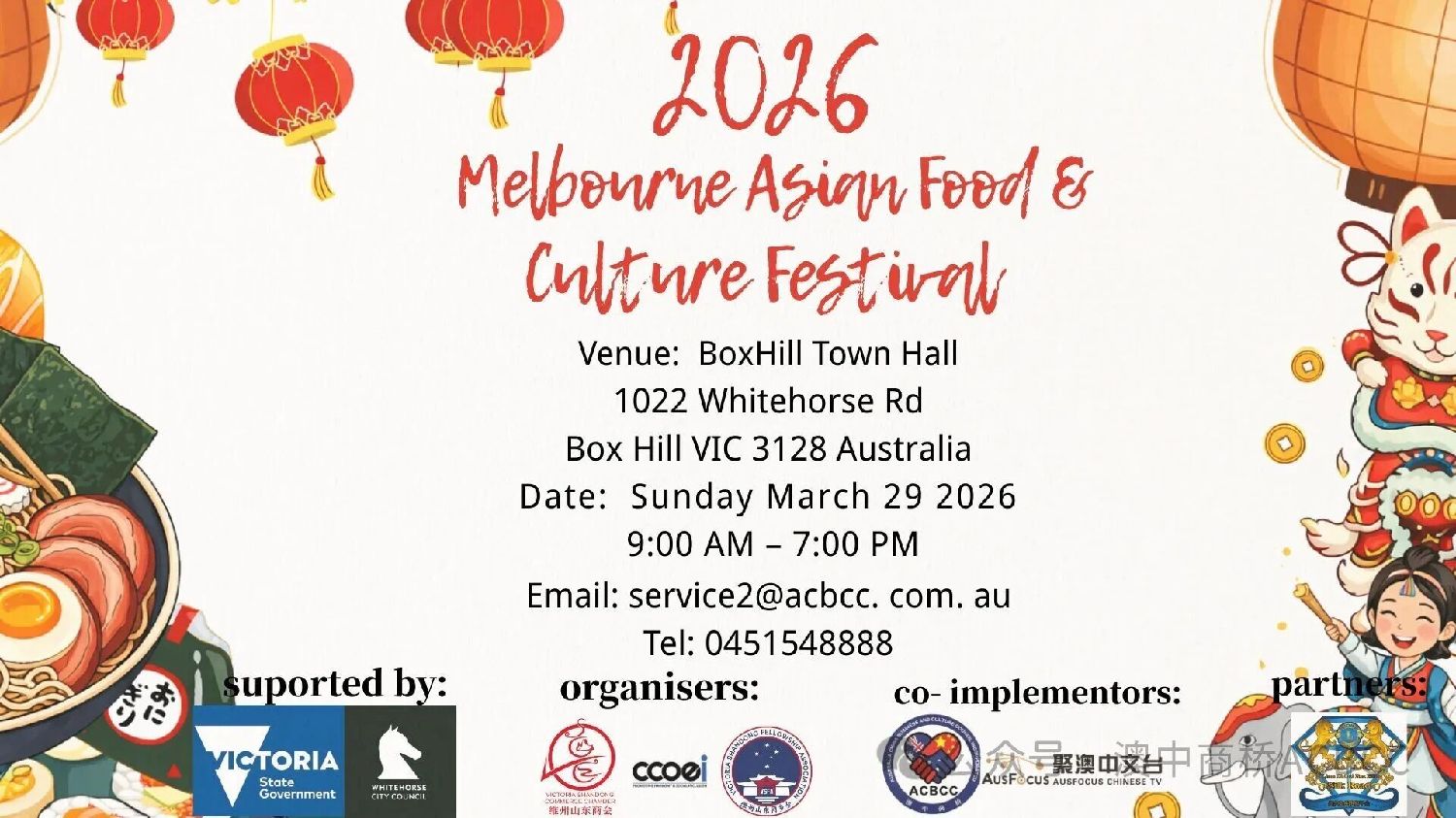 2026年3月29日,南半球的墨尔本将迎来一场跨越地域、连接心灵的里程碑式盛会——“首届墨尔本亚洲美食文化节”。在维多利亚州政府与Whitehorse City Council的鼎力支持下,由维多利亚州山东同乡会、维州山东商会以及CCOEI联合主办,携手澳中商贸文化促进会(ACBCC)等多个亚洲背景社团共同承办。