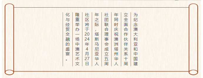 为纪念澳大利亚和中国建立全面合作伙伴关系十周年,同时庆祝澳洲塔州华人社团联合理事会成立五周年,塔斯马尼亚华人社区将于2024年4月27日隆重举办一场中澳艺术文化与经贸交融的盛宴。