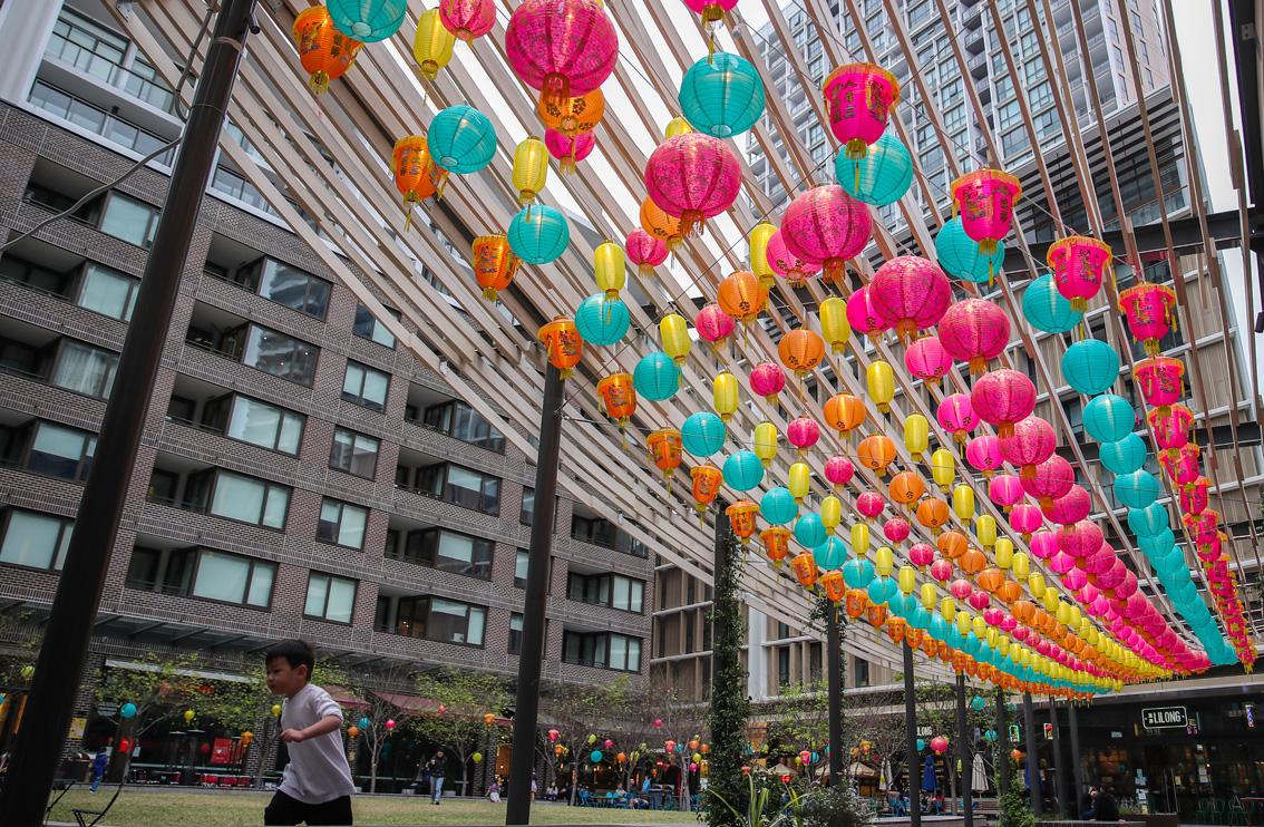 9月30日,在澳大利亚悉尼,一名儿童在灯笼下玩耍。