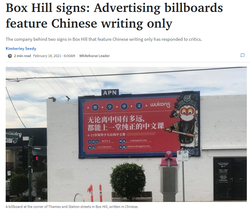 《先驱太阳报》18日报道,两个纯中文的广告牌在墨尔本的博士山(Box Hill)竖立之后,引发了争议。在墨尔本市中心的两个繁忙的十字路口都竖立着这些大广告牌,广告牌上除了网址和电子邮件外,没有任何的英文字母存在。这些广告表示来自于一家提供儿童汉语课程的领先在线教育平台。广告中的中文大字写道:“无论离中国有多远,都能上一堂纯正的中文课。”下方则用小字写道:“4-15岁海外少儿在线中文课。”