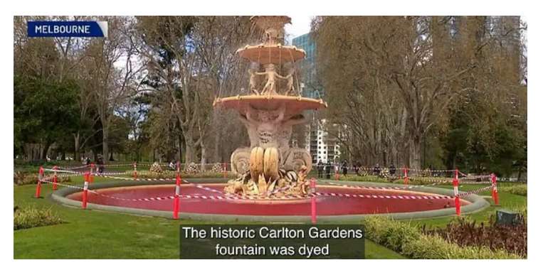 墨尔本吃饭吧微信公众号22日报道,警方表示,事件发生在周五(19日)傍晚6点至周六清晨6点之间,喷泉雕像上被泼洒红漆,水池瞬间变成“血池”般的景象,严重破坏了这一世界文化遗产景观的庄严感。