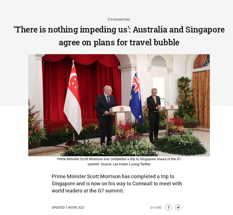 Morrison)提前与新加坡总理李显龙(Lee Hsien Loong)会面。双方就旅行泡泡以及两国间数字经济、医疗和环境等事宜进行商讨,同时李显龙也建议莫里森应与正在崛起的且更加自信的中国接触。
