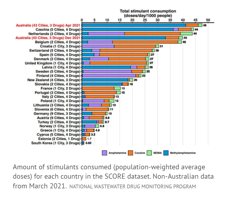 澳洲的甲基苯丙胺(methamphetamine,即冰毒的有效成分)使用量非常高,超过了许多国家对所有主要兴奋剂的使用量。阿德莱德的甲基苯丙胺千人日均使用量为1325毫克,珀斯为1033毫克,第三名为悉尼和墨尔本(千人日均使用量为1025毫克),霍巴特录得了全澳最低的甲基苯丙胺使用量,为千人日均500毫克。在28个国家129个城市的标准化比较中,澳洲的非法兴奋剂使用(苯丙胺、甲基苯丙胺、亚甲二氧基甲基苯丙胺和可卡因)排名第一,该比较由主要是欧洲实验室的SCORE Network协调进行的。澳洲的项目追踪了三种阿片类药物:海洛因、芬太尼和羟考酮。结果显示,在测试周期间,墨尔本千人日均使用221毫克海洛因,但芬太尼和羟考酮的用量最低。悉尼的海洛因使用量为千人日均123毫克,位居第二,其次是布里斯班,为千人日均93毫克。霍巴特是海洛因使用率最低的城市之一(千人日均23毫克),但是该城市在芬太尼和羟考酮的使用量上却领先全国。