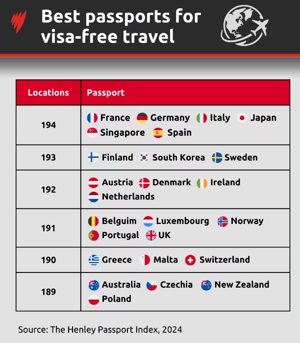 SBS中文报道,根据国际航空运输管理局(IATA)的数据,总部位于伦敦的投资移民咨询公司Henley&Partners将199个国家护照的免签证入境与全球227个地点进行了比较,并根据旅行自由度对它们进行了排名。