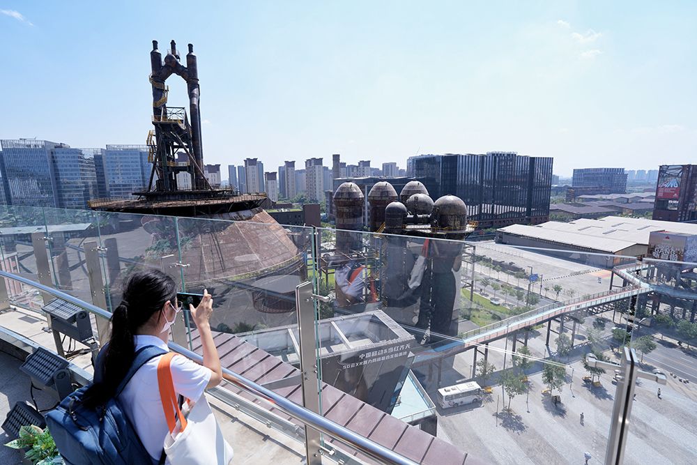 图为8月11日,参观者拍摄中国国际服务贸易交易会(简称“服贸会”)永久会址北京首钢园区。(图/中新社)