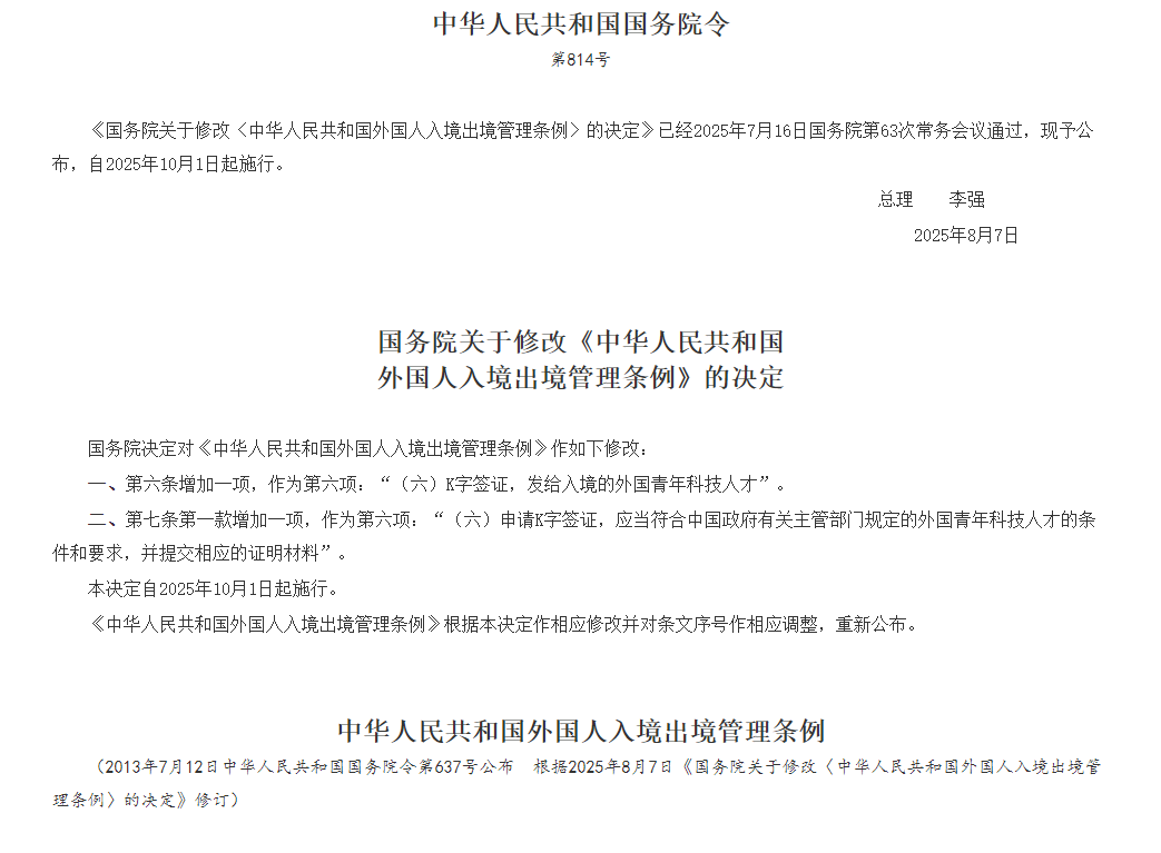 2025年8月7日,中国国务院总理李强签署第814号国务院令,公布《国务院关于修改〈中华人民共和国外国人入境出境管理条例〉的决定》(以下简称《决定》),自2025年10月1日起施行。日前,中国司法部、中国外交部、中国公安部、中国国家移民局负责人就《决定》的有关问题回答了记者提问。