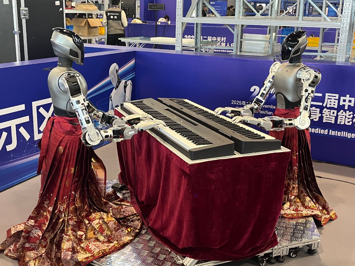 11月17日至18日,2025年第二届中关村具身智能机器人应用大赛决赛在北京举办。图为18日比赛现场的机器人演奏。(图/中新社)