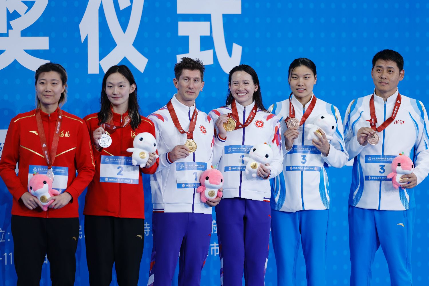11月13日,第十五届全国运动会女子200米自由泳决赛在深圳大运中心游泳馆开赛,香港队何诗蓓(左四)夺得金牌,河北队李冰洁(左二)和浙江队柳雅欣(右二)分别获得银牌和铜牌。图为颁奖仪式。(图/中新社)
