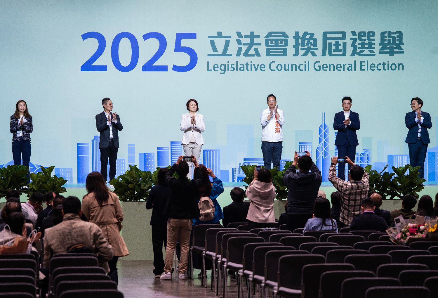 12月8日清晨,香港特区第八届立法会选举分区直接选举界别投票结果在位于香港会议展览中心的中央点票站新闻中心陆续公布。全国人大常委会委员李慧琼在九龙中地方选区胜出,成功连任香港特区立法会议员。图为李慧琼(左三)等在宣布选举结果时登台亮相。(图/中新社)