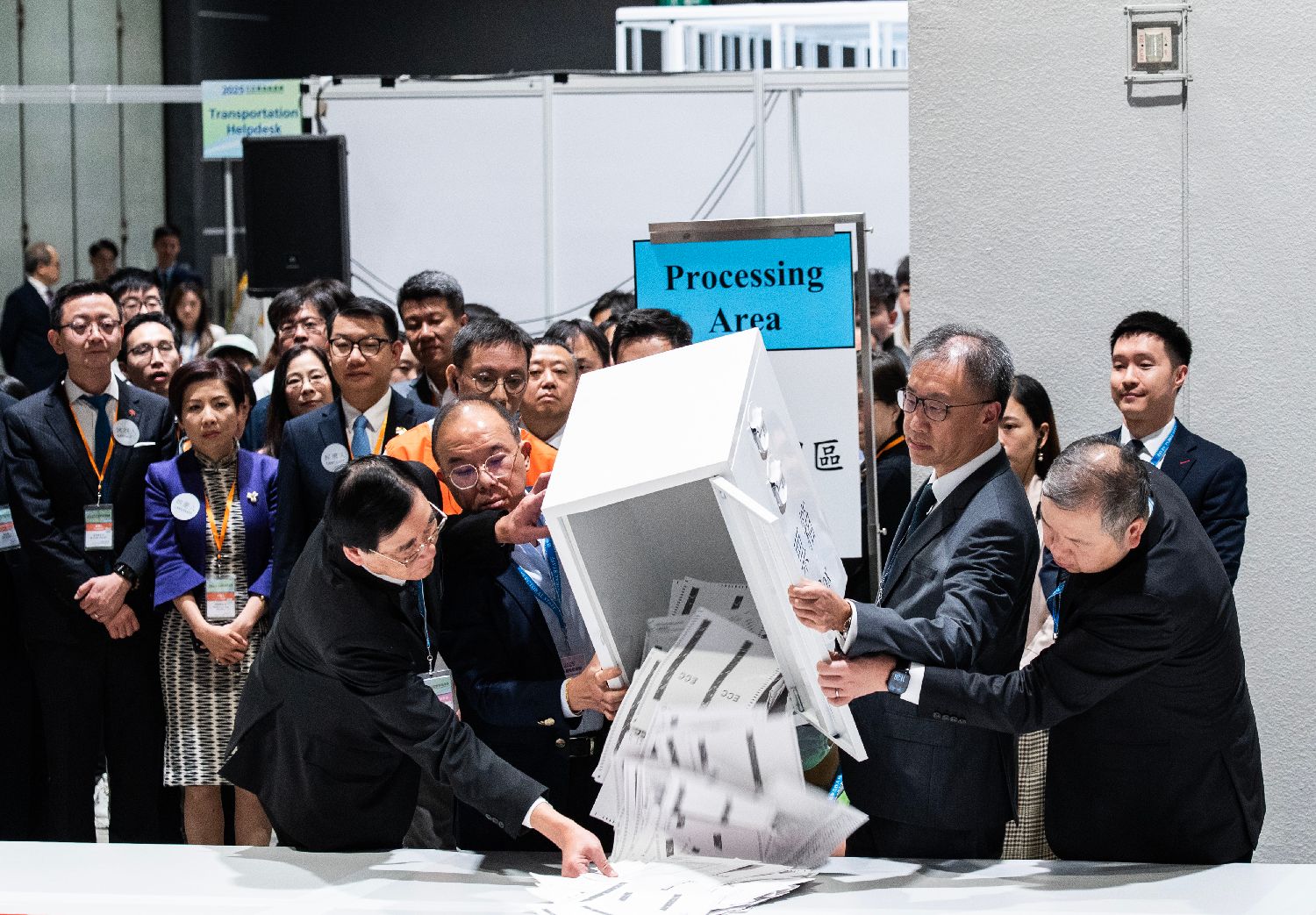 图为香港特区政府政制及内地事务局局长曾国卫(前排左二)、香港特区选举管理委员会主席陆启康(前排右二)、选举管理委员会委员石丹理(前排左一)、选举管理委员会委员文本立(前排右一)在位于香港会议展览中心的中央点票站倒出选举委员会界别投票箱中的选票。(图/中新社)