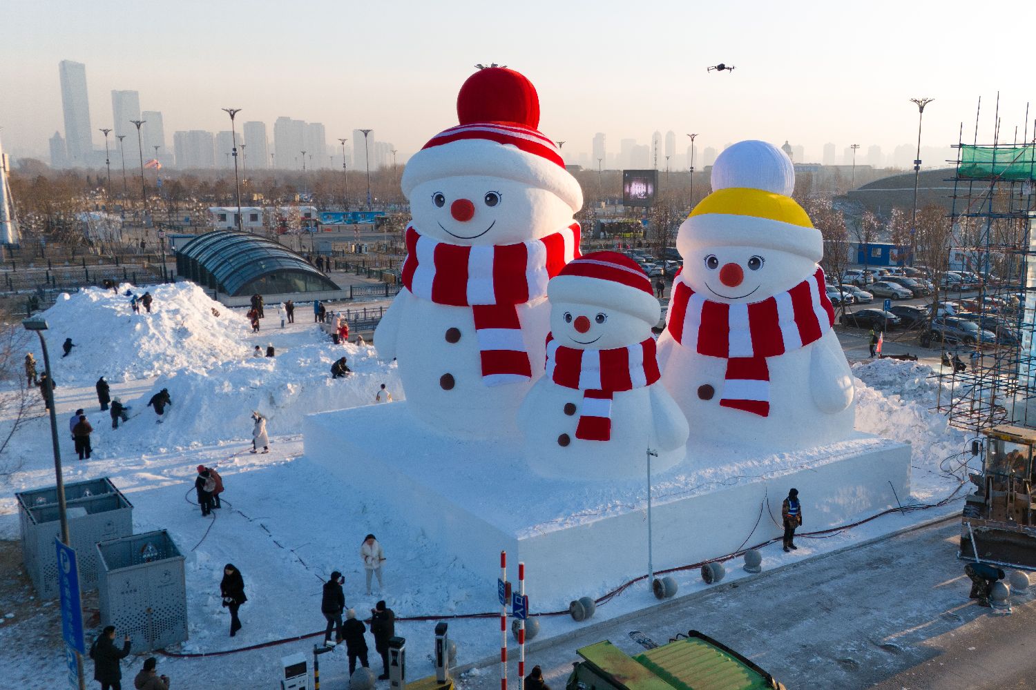 图为12月13日,黑龙江哈尔滨,雪雕“童话雪人一家”吸引游客打卡。第二十七届哈尔滨冰雪大世界“迎宾先行者”——“童话雪人一家”已于日前完成雕刻,雪雕高15米,用雪量近4000立方米。(图/中新社)