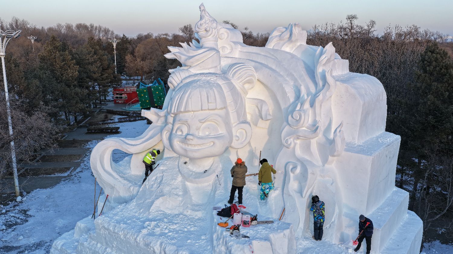 图为施工建设中的哪吒形象雪雕作品。(图/中新社)