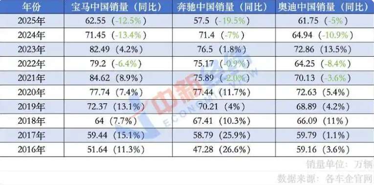 综合北京中新经纬、郑州大象新闻、上海第一财经报道,数据显示,2025年,BBA中国市场销量水平回到了七八年前。