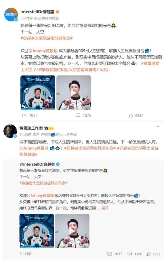 图为@interstellOr穿越者官宣@Johnny黄景瑜成为009号太空游客。(图/微博截图)