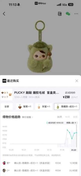 图为“PUCKY敲敲系列”毛绒挂件市场溢价数倍。(图/得物APP截图)