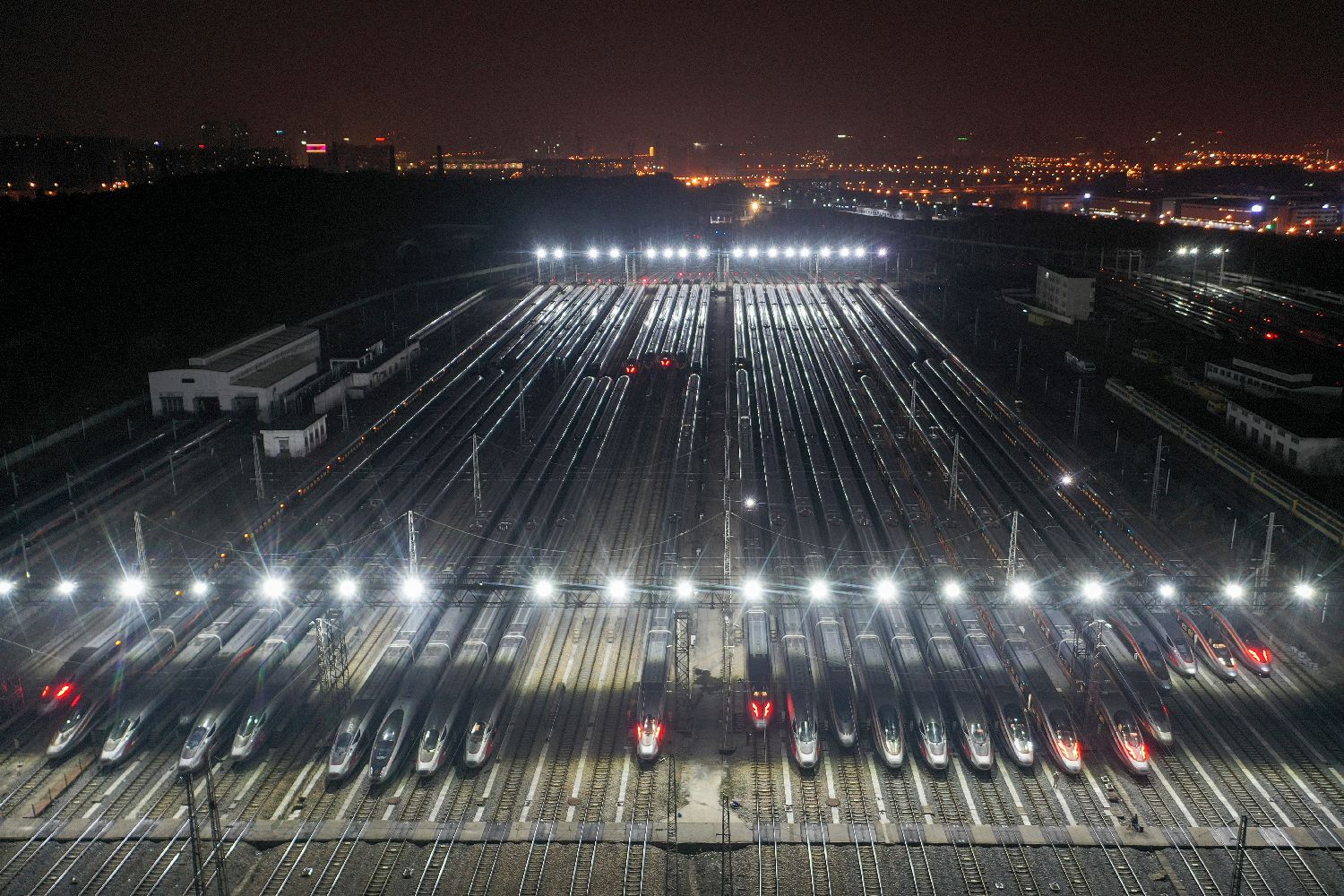 2月2日凌晨,国铁广州局集团长沙车辆段工作人员在长沙动车所为2026年春运启幕做准备,连夜对动车组开展检修,全力保障春运列车安全运行。图为众多列车停靠在长沙动车段的存车线上蓄势待发。(图/中新社)
