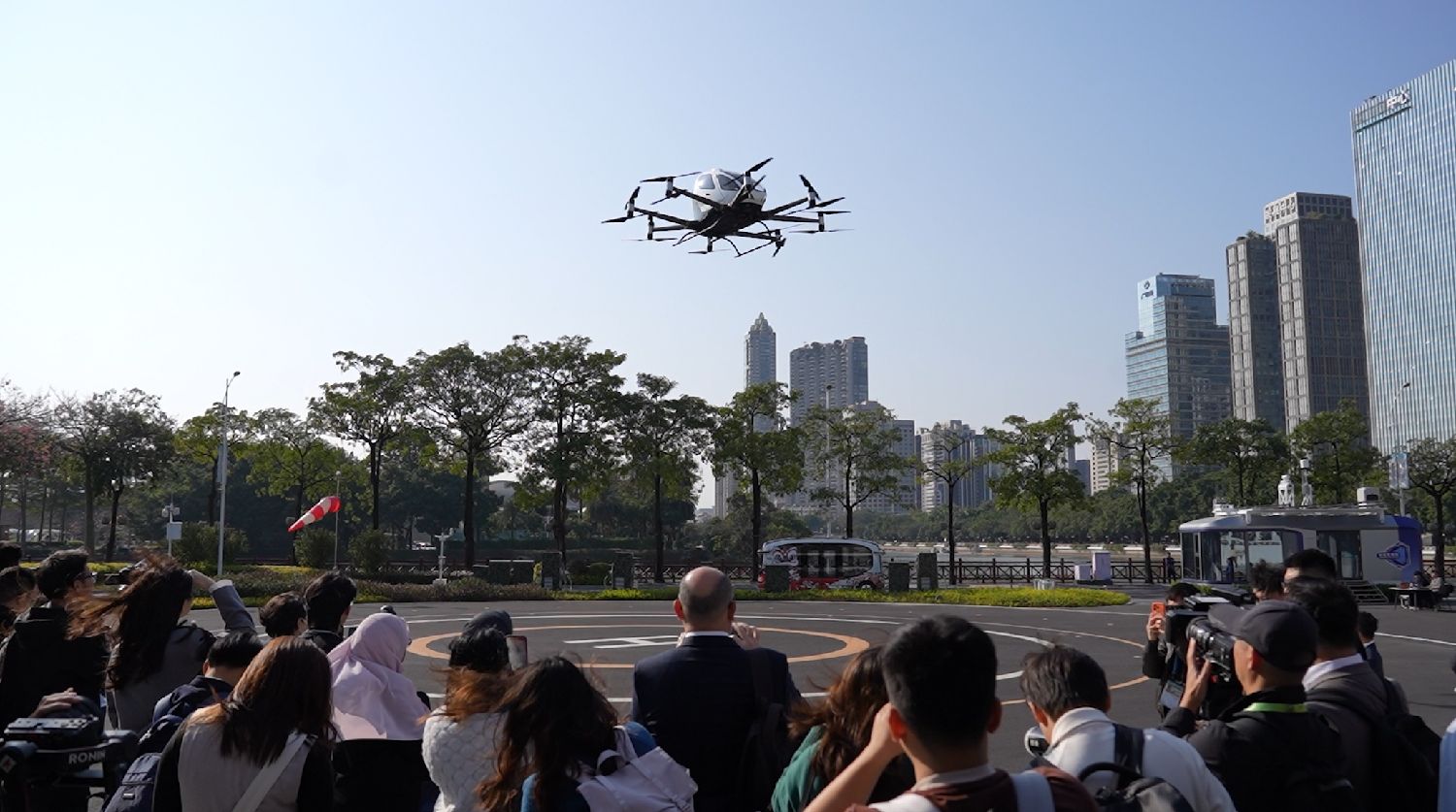 图为2月2日,广东广州,亚太经合组织(APEC)第一次高官会及相关会议参会代表参观飞行汽车。(图/中新社)