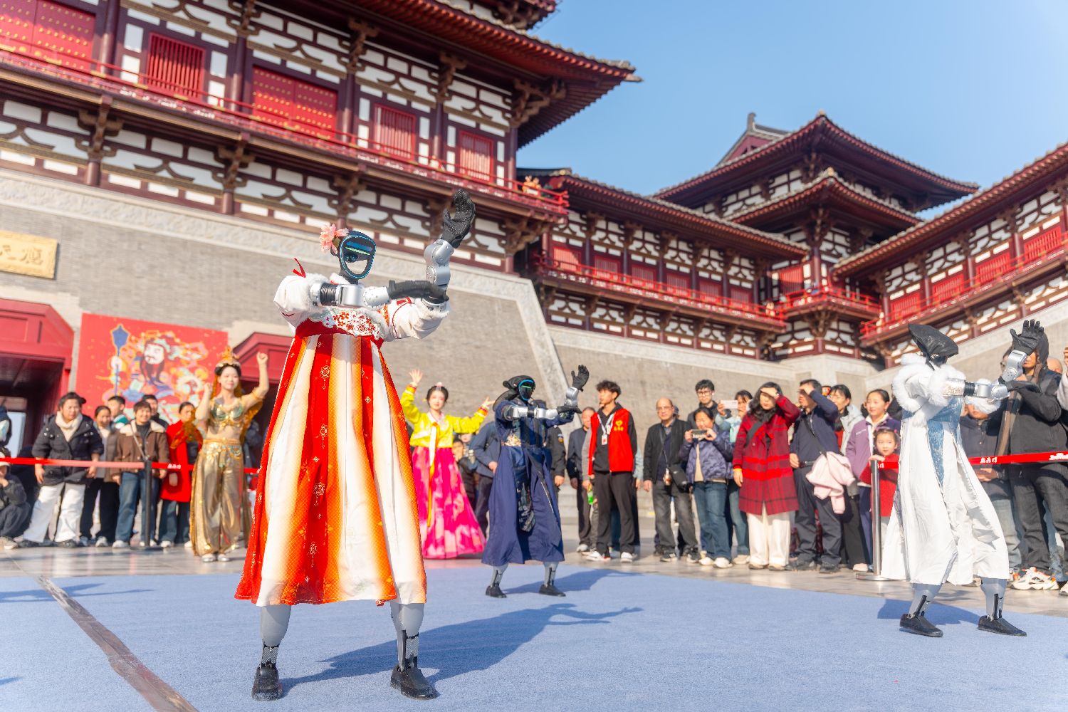 图为2月18日,身着汉服的机器人亮相河南洛阳隋唐洛阳城,与景区演员进行互动表演。(图/中新社)