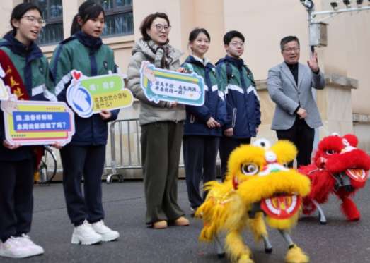 一大早,北京外国语大学附属上海闵行田园高级中学门口,两只身披红黄舞狮服的机器狗成为迎接同学们返校的“特殊使者”。学生们熟练操控着两只机器狗,只见它们灵活地摇头摆尾、踏步转身,时而做出跳跃、作揖的动作,逗得师生哈哈大笑。