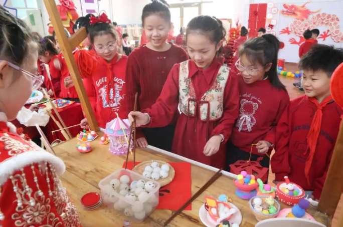 在贵州遵义播州区第一小学翰林校区,学校将开学典礼与传统文化、劳动实践深度融合,把开学第一课搬进灯谜长廊和“迷你厨房”。各班级教室当天变身“迷你厨房”。老师们讲解元宵节由来后,家长们手把手教孩子们揉面、包馅。同学们化身小厨师,有模有样地包汤圆、捏饺子,欢声笑语充满教室。