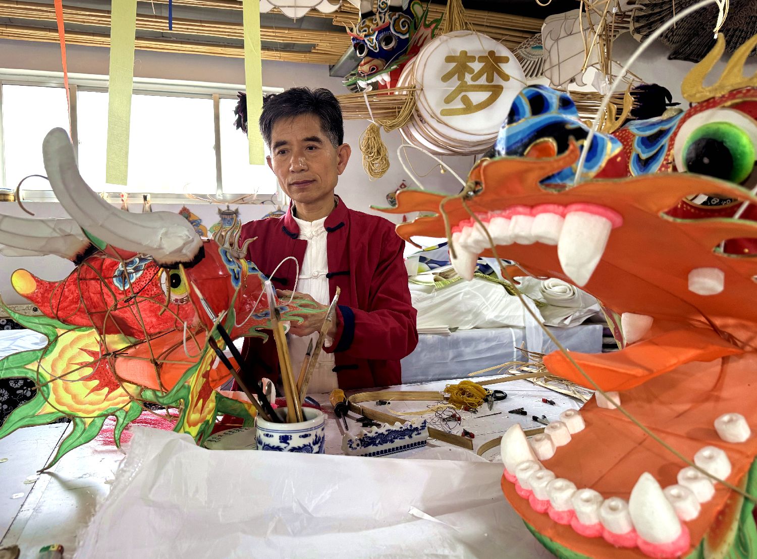 图为2月24日,山东潍坊,郭洪利在工作室赶制龙头蜈蚣风筝。(图/中新社)