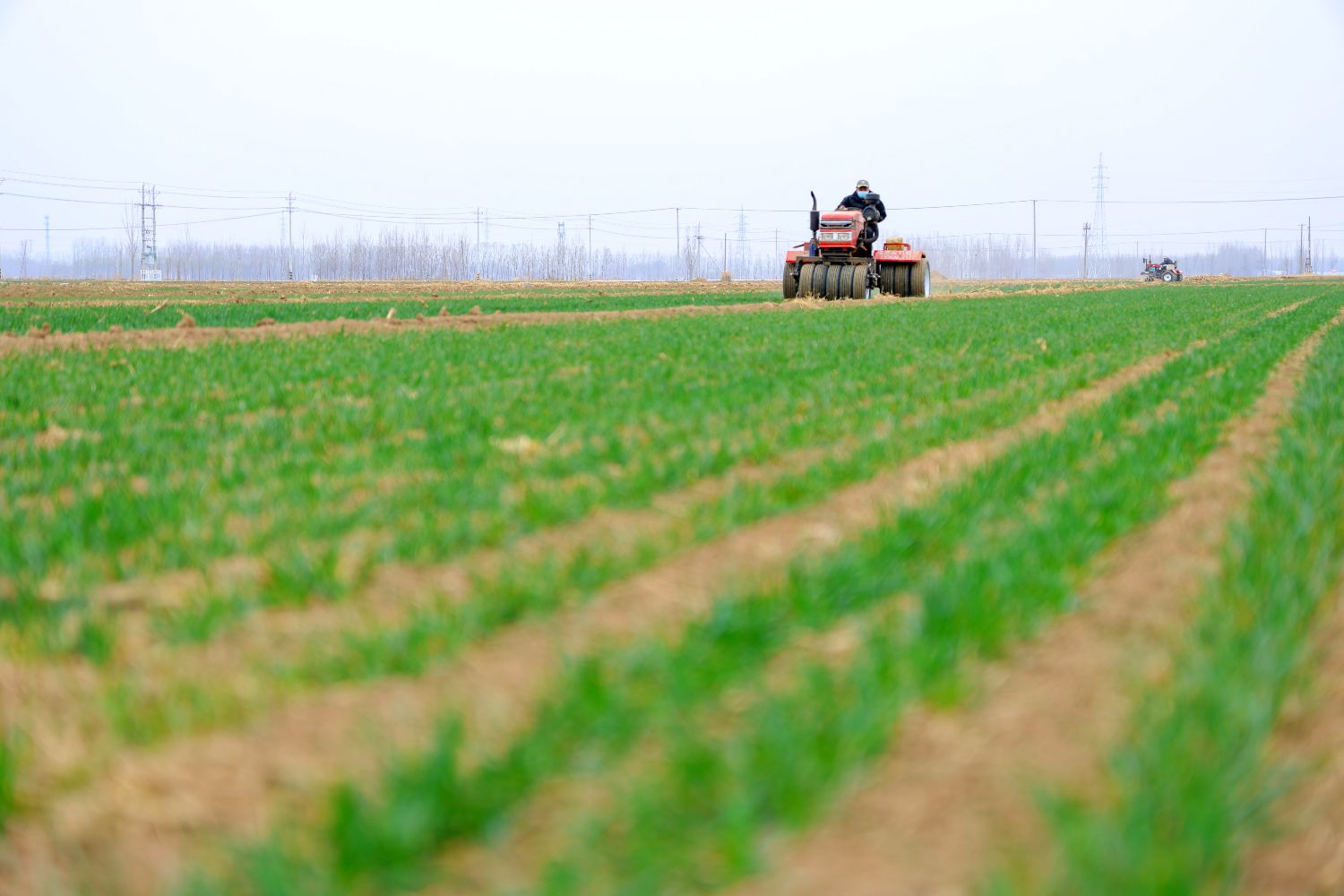 图为2月25日,山东聊城茌平,农民驾驶农机,对小麦进行春管作业。(图/中新社)