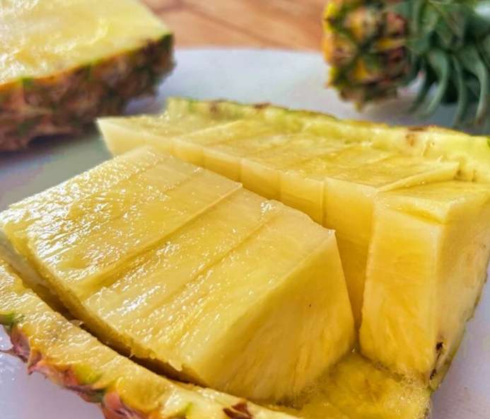 图为刚切开的凤梨,每一丝纹理都浸透了蜜色汁水,衬得果肉愈发晶莹。(图/中新网)