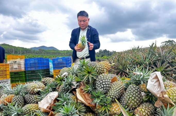 图为3月11日,在海南万宁龙滚,曾才在凤梨种植基地查看采收的凤梨品质。(图/中新网)