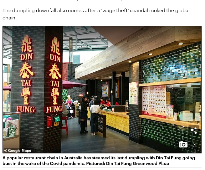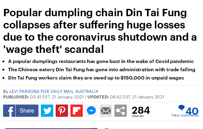 墨尔本微生活微信公众号报道,勉强撑过了2020年,著名中餐厅鼎泰丰还是抵挡不住疫情和欠薪丑闻的双重冲击,于2021年年初宣布破产中。