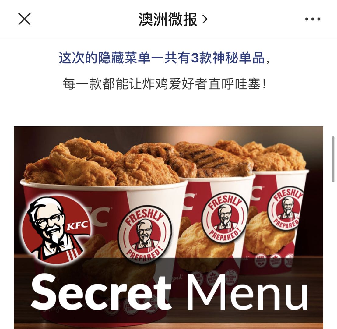 澳洲微报报道,星巴克的隐藏菜单曾火爆一时,不少人纷纷前去打卡。听到隐藏这两个字,就让人忍不住想要尝试一下。没想到澳洲肯德基竟然也有这样一份神秘的「隐藏菜单」!