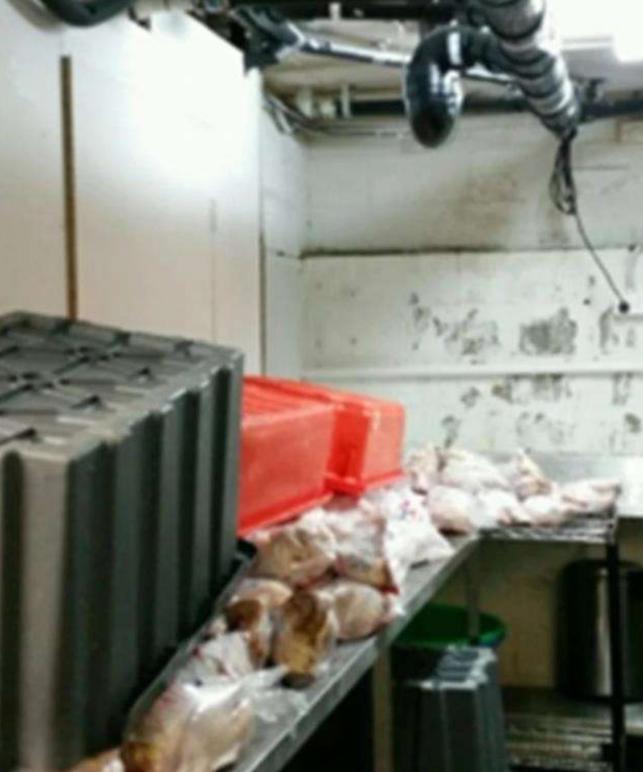 去年12月检查时拍摄的照片显示,该餐厅将食材存放在室温环境下,还有部分食材在不合标准的食材解冻区解冻。