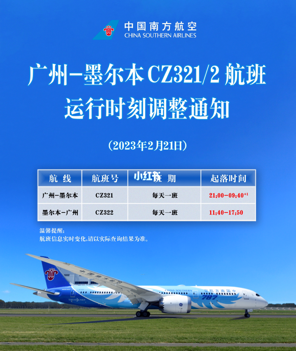 公告说:因航班运行需要,自即日起,南航广州-墨尔本CZ321/2航班运行时刻将做出调整如下: