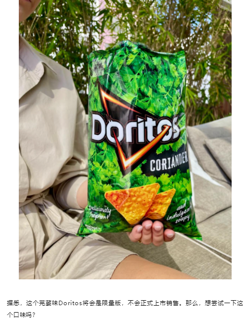 据悉,这个芫荽味Doritos将会是限量版,不会正式上市销售。那么,想尝试一下这个口味吗?