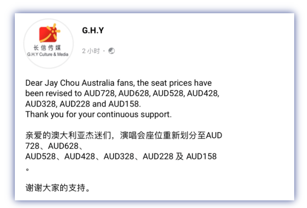 公告中写道,亲爱的澳洲杰迷们,演唱会座位重新划分至AUD728、AUD628、AUD528、AUD428、AUD328、AUD228及AUD1580,谢谢大家的支持。